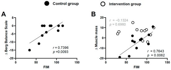 Correlations between the FIM score and ΔBBS (A) and Δmuscle mass (B) in the control group and the intervention group. Strong correlations were observed between the FIM score and Δmuscle mass and ΔBBS in the control group; this finding was not observed for the intervention group (Bonferroni correction; critical alpha < 0.05/2 = 0.025). Data from the intervention group are not shown in Figure A because none of the individuals in this group had a decreased BBS score.