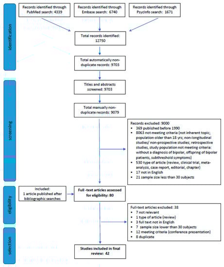 A systematic review of relevant publications was conducted in accordance with the Preferred Reporting Items for Systematic Reviews and Meta-Analyses (PRISMA) statement [18]. A literature search was conducted electronically in three databases (PubMed, Embase, and PsycInfo) on 13 November 2020. The search terms were: “bipolar disorder” or “mania” and “child” or “adolescent” and “outcome” or “prognosis” or “course” or “longitudinal”, with a time filter for date of publication set to after 1989. The time frame was limited to the last 30 years because the diagnostic construct of bipolar disorder was previously infrequently applied to children, but has become increasingly used since the 1990s [11]. The complete search string is available in Supplementary Table S1.