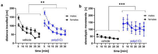 Poly(I:C) exposure increased repetitive-like marble-burying behavior. Data are presented as the percentage of buried marbles (a) and distance traveled (b). Symbol: ** p < 0.01, a significant difference between vehicle- and poly(I:C)-exposed animals in a given sex group (Mann–Whitney U test).