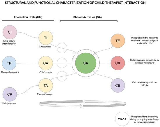 Interaction units (IUs) provide an annotation set mainly focused on the initial phase of agreement between the social partners in terms of different types of proposals and consist of 3 couples of paired codes. From such states, child and therapist may achieve the onset of a shared activity that presents the characteristics of interpersonal synchrony. Therefore, a sequence of units can be thought of as a composition of blocks building the interaction and may be useful as a representation of both its structure and dynamics. Additionally, three codes describe the conclusion of the shared activity.