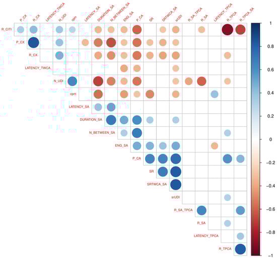 Correlation plot between behavioral descriptors (Pearson’s product–moment correlation coefficient). Significant correlations are reported (p < 0.05).