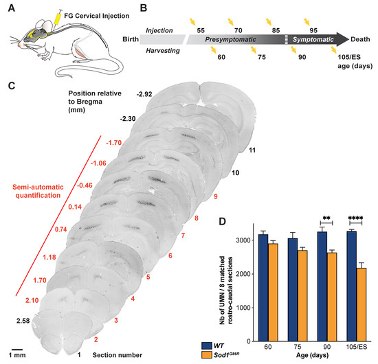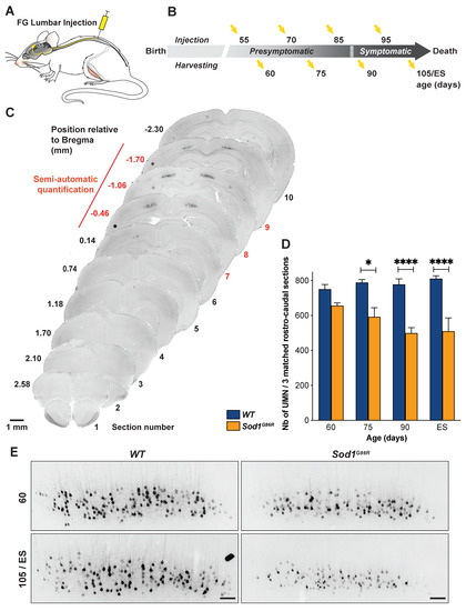 Lumbar-projecting UMN degenerate earlier than the rest of the UMN population. (A) Schematic of the experimental design: UMN were retrogradely labelled upon Fluorogold (FG) injection into the lumbar portion of the spinal cord. (B) Ages of injection and harvesting. (C) Representative negative fluorescence images of brain coronal sections numbered 1 (Bregma 2.58 mm) to 10 (Bregma −2.30 mm) showing FG-labelled UMN in the cerebral cortex of a 75 day-old WT mouse. Upon FG injection into the lumbar portion of the dorsal funiculus, labelled UMN were consistently observed from Section 7 (Bregma −0.46 mm) to 9 (Bregma −1.70 mm). Red numbering and line indicate the sections that were further processed for UMN quantifications. (D) Bar graph representing the average number of UMN present on three equally spaced caudal coronal sections matched between Sod1G86R (orange) and WT mice (blue), at 60, 75, 90, and 105 days of age or end stage (ES). N = 4 WT and 3 Sod1G86R at 60 days; 4 WT and 3 Sod1G86R at 75 days; 5 WT and 5 Sod1G86R at 90 days; and 4 WT and 4 Sod1G86R at 105 days/ES (end stage). Note the early and progressive loss of labelled UMN in the brain of Sod1G86R animals. (E) Representative negatives images of fluorescence of brain coronal sections (Bregma −1.06 mm) showing the decreased number of FG-labelled UMN in the cerebral cortex of Sod1G86R mice at 60 days of age and at end stage (ES) compared to their WT littermates. * p < 0.05 and **** p < 0.0001 in multiple comparisons test. Scale bar = 1 mm in (C) and 100 µm in (E).