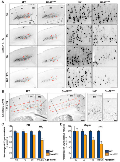 Progressive loss of UMN is confirmed by in situ hybridization. (A) Representative negative fluorescence images of brain coronal sections (Bregma 0.74 mm, corresponding to Section 5 for Figure 1) showing FG-labelled UMN in the cerebral cortex of WT and Sod1G86R mice of 60, 75, 90, and 105 days of age or end stage (ES). Red shapes indicate the positions where the close-ups of the right panels were acquired. (B) Representative images of in situ hybridization on brain coronal sections of ES Sod1G86R and 115 day-old WT control mice showing decreased Crym expression in the layer V of the cerebral cortex. Dotted red rectangles indicate the areas where Crym-positive neurons were counted. Close-ups are shown in the right panel. (C) Bar graph representing the percentage of FG-positive neurons in Sod1G86R mice (orange) relative to their WT littermates (blue) over time. (D) Bar graph representing the percentage of Crym-positive neurons in Sod1G86R mice (orange) relative to their WT littermates (blue) over time. N = 5 WT and 6 Sod1G86R at 60 days; 6 WT and 3 Sod1G86R at 75 days; 5 WT and 6 Sod1G86R at 90 days; 5 WT and 5 Sod1G86R at 105 days/ES (end stage). ** p < 0.01 and *** p < 0.001 in multiple comparisons test. Scale bars = 200 µm in the left panels and 50 µm in the right panels of (A,B). M1, primary motor cortex; M2, secondary motor cortex; S1, primary somatosensory cortex.