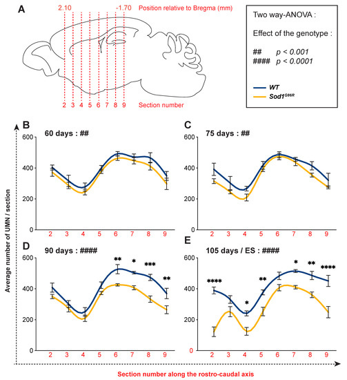 In mice, UMN are topographically organized within the motor and somatosensory cortices along the rostro-caudal and the medio-lateral axes, and project accordingly to different portions of the spinal cord [26]. Sampling the whole population of UMN along the rostro-caudal axis enabled us to test whether their degeneration was homogeneous, or rather selectively affected sub-populations. We thus quantified the number of UMN present on each of the eight selected coronal sections of WT and Sod1G86R brains at each of the four time points of interest (Figure 3A). Using this approach, we observed that the number of UMN was uneven along the rostro-caudal axis, with a minimal number of neurons found in Section 4 (Bregma +1.18 mm) and a maximum found in Sections 6 and 7 (Bregma +0.14 and −0.46 mm) (Figure 3B–E). At the presymptomatic ages 60 d and 75 d, two-way ANOVA analyses revealed a significant difference between the two genotypes (p = 0.0064 at 60 d and p = 0.0096 at 75 d; Figure 3B,C), but no difference was seen at the section level using multiple comparisons test. However, from 90 d on, we observed in addition to the overall genotype effect (p < 0.0001 both at 90 d and disease end stage in two-way ANOVA), significant reductions of the number of UMN in individual sections. This started at 90 d with the most caudal sections (Section 9: 28.4% loss p < 0.001; Section 8: 29.6% p < 0.001; Section 7: 19.2% p < 0.05; Section 6: 19.2% p < 0.01; Figure 3D) and propagated rostrally to reach almost all the sections at disease end stage (section 9: 44.6% loss p < 0.001; Section 8: 26.6% p < 0.01; Section 7: 20.16% p < 0.05; Section 5: 32.77% p < 0.01; Section 4: 48.2% p < 0.05; Section 2: 68.7% p < 0.0001; Figure 3E). Within the caudal part, Section 9 remained the most severely affected, with a loss of 44.68%, but overall, the most impacted section was the rostral Section 2, with a late and abrupt loss of 68.67% (Figure 3E). Together, the data show that UMN degeneration is not even along the rostro-caudal axis in Sod1G86R mice: it starts with the most caudally located ones and progresses rostrally over time.