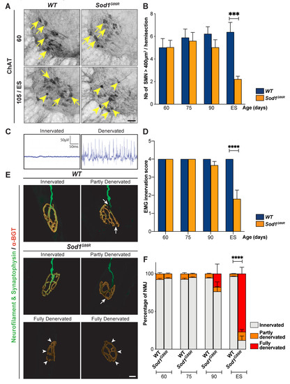In Sod1G86R mice, LNM degeneration starts after the loss of the first UMN. (A) Representative images of coronal sections of the spinal cord of WT and Sod1G86R mice at 60 and 105 days or end stage (ES), showing Choline AcetylTransferase-positive neurons (ChAT) present in the ventral horn. Arrows indicate large ChAT-positive neurons, arrowheads indicate smaller or shrinked ChAT-positive neurons. (B) Bar graph representing the average number of large ChAT-positive neurons, with an area ≥ 400 µm2, counted in the ventral horn of lumbar spinal cord sections from WT (blue) and Sod1G86R mice (orange) at 60, 75, 90, and 105 days of age or ES. (C) Representative electromyography recordings of an intact, innervated muscle (left), and of a denervated muscle presenting fasciculations (right). (D) Bar graph representing the EMG innervation scores calculated for Sod1G86R and WT mice. (E) Representative maximum intensity projection images of z-stacks of typical innervated, partly or fully denervated neuromuscular junctions (NMJ) from 90 day-old Sod1G86R and WT mice upon labelling of presynaptic elements with neurofilament and synaptophysin (green) and postsynaptic elements with alpha-bungarotoxin (α-BGT, red). (F) Bar graph representing the average proportions of innervated (grey), partly denervated (orange), or fully denervated (red) NMJ upon staining and microscopy analysis of one tibialis anterior muscle of WT and Sod1G86R mice at 60, 75, 90, and 105 days of age or end stage (ES). N = 5 WT and 6 Sod1G86R at 60 days; 6 WT and 3 Sod1G86R at 75 days; 5 WT and 6 Sod1G86R at 90 days; and 5 WT and 5 Sod1G86R at 105 days/ES. *** p < 0.001 and **** p < 0.0001 in multiple comparisons test (B,D) and multiple t tests (F). Scale bar = 50 µm in (A) and 10 µm in (E).