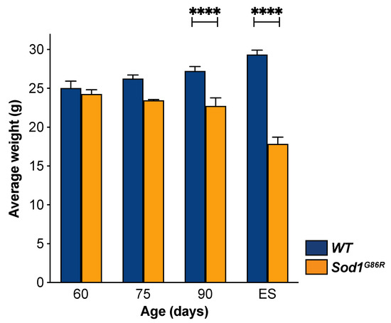 ALS is not only characterized by the signs of UMN and LMN degeneration, but also by an important weight loss that often starts decades before appearance of the first motor symptoms [29]. Similarly, Sod1G86R mice were shown to start losing weight pre-symptomatically, as soon as 75 d of age [30]. To better determine the earliness of UMN degeneration in the course of the disease, we analyzed weight loss in our group of animals and applied similar statistical analyses as for the other parameters (Figure 6). As expected, two-way ANOVA revealed a genotype effect (p < 0.0001), and multiple comparisons test unraveled significant differences at 90 d and disease end stage (p < 0.0001 in both case), but not at earlier ages, suggesting that weight loss cannot be detected pre-symptomatically in small cohorts of Sod1G86R mice, as we used in this study.