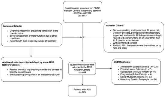 Data collection for this multi-center cross-sectional study took place between August 2018 and March 2020. The questionnaire was sent to 17 cooperating MND Network Centers across Germany [37] (Hannover; Munich (Technical University of Munich and Ludwig Maximilian University of Munich); Dresden; Würzburg; Bad Sooden-Allendorf; Bochum; Erlangen; Ulm; Mannheim; Halle-Wittenberg; Rostock; Leipzig; Regensburg; Göttingen; Münster and Essen). Patients were either screened for enrolment during their routine medical visits, or screening was based on their last recorded medical visit. In the latter case, the questionnaire was sent by mail. We do not expect that the method of patient screening would influence our results, as the patients filled in the questionnaire by themselves in both circumstances. Inclusion and exclusion criteria and the full data collection process is shown in Figure 1. In total, 325 ALS patients diagnosed with clinically possible, probable (including laboratory supported) and definite ALS, following the revised El Escorial criteria [38], were included in the statistical analysis. Patients diagnosed with an MND other than ALS were not analyzed for the purpose of this paper, but their data will be presented in further studies.