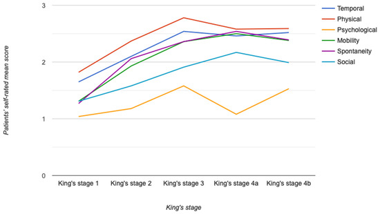 In our cohort, increased disease severity according to the King’s stages was associated with higher impact on all activities of daily living (Figure 2). This association was evident up to and including King’s stage 3. However, for King’s stage 4a and 4b, the self-rated scores either plateaued or slightly decreased. Additionally, regardless of King’s stages, the mean scores in the psychological area, compared to the impact on the other areas, were consistently lower, suggesting less of an impact on daily activities.