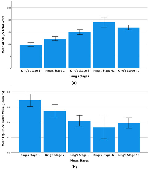 (a). Mean ALSAQ-5 total score on the basis of King’s stages. (b). Mean EQ-5D-5L index value (Germany) on the basis of King’s stages. Charts comparing the total mean scores of the ALSAQ-5 and EQ-5D-5L, according to their own scales, based on the King’s stages. For the ALSAQ-5 score, the higher score reflects a worse QoL, whereas for the EQ-5D-5L index value (Germany), the higher score reflects a better QoL. Accordingly, normality for King’s stage 4a was proven according to the Kolmogorov–Smirnov test. Error bars = 95% confidence interval. Significance levels, Figure 3a: p ≤ 0.01 (found after pairwise comparison between all King’s stages using the Student’s t-test). Significance levels, Figure 3b: p ≤ 0.05 (a statistically significant difference was found between King’s stage 1 and 2 compared with all other stages using the Student’s t-test in a pairwise comparison). Abbreviations: ALSAQ-5, Amyotrophic Lateral Sclerosis Assessment Questionnaire 5; EQ-5D-5L, EuroQol Five Dimension Five Level Scale; King’s stage, King’s College Staging System and QoL, quality of life.