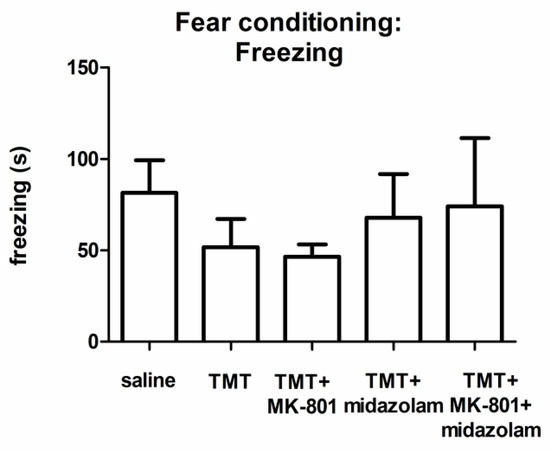 The number of animals in groups was: 7 animals in saline, 8 animals in TMT, 6 animals in TMT + MK-801, 6 animals in TMT + midazolam, and 5 animals in TMT + MK-801 + midazolam group.
