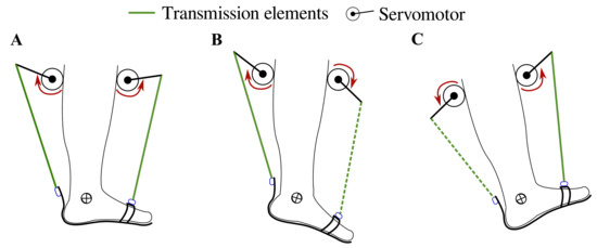 T-FLEX’s actuation system states for gait assistance. The red arrows indicate the actuator direction of rotation to assist (A) stance phase, (B) propulsion during toe-off, (C) and foot clearance in swing and heel strike phases. The segmented and continuous lines refer to the transmission elements’ participation in each movement, i.e., in plantarflexion, only the posterior element works, and in dorsiflexion only the frontal element is transmitted.