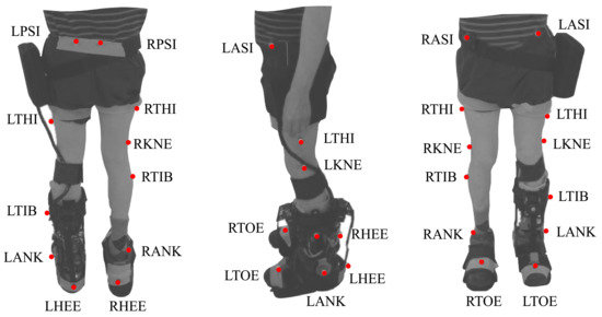 Biomechanical setup model used in the study for each participant based on the plug-in gait marker model. The red points on the patient represent the markers and the biological landmarks for the VICON acquisition system. This model involves markers in the Right and Left Posterior Iliac Spines (RPSI and LPSI), Right and Left Anterior Superior Iliac Spines (LASI and RASI), Right and Left Thighs (RTHI and LTHI), Right and Left Knees (RKNE and LKNE), Right and Left Tibias (RTIB and LTIB), Right and Left Ankles (RANK and LANK), Right and Left Toes (RTOE and LTOE), and Right and Left Heels (RHEE and LHEE).