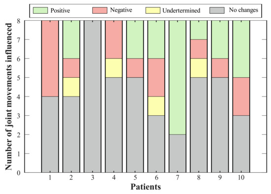 Thus, Figure 5 summarizes the consequences of using the T-FLEX system actuation on the analyzed joints for each participant. The positive effects indicate improvement in the ROM of the corresponding joint, this value approaching healthy ranges. Negative impacts show a pattern disruption, and hence a distancing of the movement from a healthy pattern. Undetermined conditions grouped changes where, although the variation was significant (i.e., above 10%), this value did not improve or impair the ROM. Lastly, the no-changes group integrates the differences between both scenarios of less than 10%.