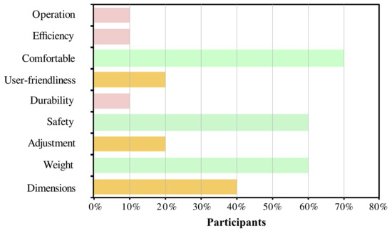 For the users’ perspective, Figure 7 shows the relevant aspects selected by the participants through the QUEST survey. The most selected parameter was the device’s comfort with 70% of recurrence. Other important aspects for the users were safety, weight, and dimensions. Finally, the level of satisfaction of the user was between satisfied and very satisfied in 60% and 40% of the users, respectively.