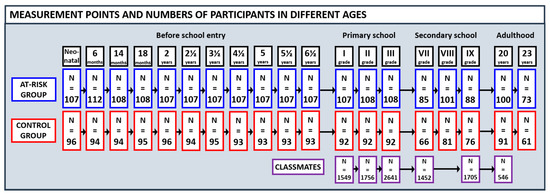 Our contribution to finding answers to the mysteries of dyslexia is the Jyväskylä Longitudinal Study of Dyslexia (JLD) [10,11,12,13]. The study is based on a prospective family risk design, which is useful for identifying early precursors of heritable developmental disabilities. By following the development of children born into families in which one of the parents and at least one of that parent’s close relatives have the disability in question, we can learn about the early development of children with an increased risk of developing the same disability. When we compare the development of children with familial risk and their peers without the risk (controls) and conduct longitudinal prediction analyses, we are able to identify early risk, protective, and promotive factors, which can be useful in trying to prevent or mitigate the reading problems.