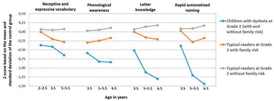 Our findings on the early cognitive markers of dyslexia in Grade 2 showed consistent differences when compared to typical readers without family risk in receptive and expressive language skills at 2–5.5 years and phonological sensitivity, letter knowledge, and rapid automatized naming at 3.5–5.5 years [70] (see Figure 3). Effect sizes were moderate, except for letter knowledge and rapid automatized naming at 5.5 years, where the effect sizes were large. In addition, these children differed from typical readers with family risk with a moderate effect size in expressive language skills at 2–2.5 years and letter knowledge and rapid naming at 3.5 and 5.5 years. In contrast to the findings in less transparent orthographies, e.g., [71,72,73,74,75], no differences were found between at-risk children without later dyslexia at school age and control children without dyslexia in these early cognitive skills, which gives only weak support to the idea of the continuous nature of vulnerability to reading difficulties.