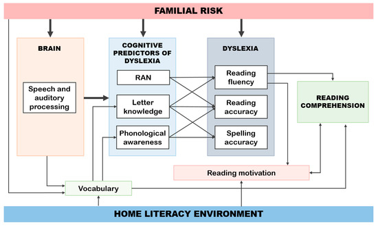 The importance of letter knowledge as a predictor of early reading skills was repeated in the studies predicting Grade 2 dyslexia [24] as well as those using the latent factors of reading and spelling accuracy and reading fluency [76]. However, these studies also suggested an important role of rapid automatized naming (RAN) and phonological awareness. In terms of early prediction of children’s Grade 2 dyslexia, letter knowledge, rapid automatized naming, and phonological awareness assessed at the ages of 3.5, 4.5, and 5.5 years were the strongest predictors [24,76]. It was noteworthy, however, that, despite the inclusion of a broad battery of predictors (phonological awareness, rapid automatized naming, short-term memory, expressive vocabulary, pseudoword repetition, and letter knowledge), family risk remained an additional significant predictor of children’s dyslexia and reading skills over and above children’s skills. The three cognitive predictors (letter knowledge, rapid automatized naming, and phonological awareness) together with family risk explained 32–35% of the dyslexia status and effectively identified the individuals at risk for dyslexia years before school entry. Conversely, good early cognitive skills decreased the risk for dyslexia substantially among at-risk children. This suggests that the same cognitive predictors may serve not only as predictors but also as protective factors against dyslexia.