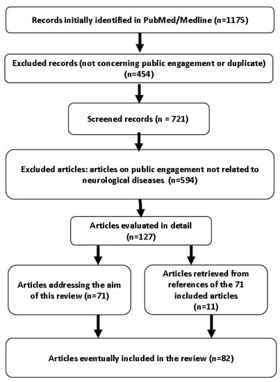 An advanced literature search in MEDLINE (accessed through PubMed) was conducted at the beginning of 2020 by two independent authors (G.A., S.E.). The search terms were “(public engagement OR third mission) AND (motor neuron disease OR amyotrophic lateral sclerosis OR Alzheimer’s OR dementia OR multiple sclerosis OR epilepsy OR stroke OR Parkinson’s disease OR headache OR migraine OR neurology and genetics)”. We ordered the results according to the “best match” filter. The search was restricted to articles from peer-reviewed journals published in English. No date restrictions were used. The repeatability of the data selection method between the 2 reviewers was tested using a stepwise searching approach. Starting from the research with the greatest number of results (“(dementia OR Alzheimer’s) AND (public engagement OR third mission)”), the first 100 results of 540 were independently evaluated by the two reviewers. Therefore, any disagreement was discussed to clarify selection criteria. Agreement on screening decisions was >95%, so the further selections regarding other combinations were performed by one reviewer only (G.A.). The reference lists of the included studies were manually searched to identify further relevant studies. A detailed flow chart of article selection is presented in Figure 1.
