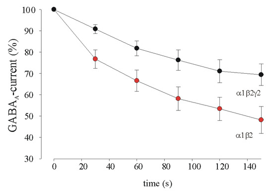 It is well-known that current desensitization may be influenced by modifications of the receptor’s affinity for neurotransmitter. In the light of our results, it is unlikely that the highest degree of GABA current rundown in α1β2 GABAARs is due to an increase of GABA sensitivity, because we did not find a different EC50 nor a faster current decay in α1β2 versus α1β2γ2 GABAARs.