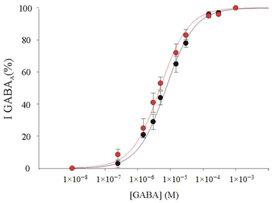 GABAARs affinity in oocytes expressing α1β2γ2 GABAARs or α1β2 GABAARs. GABA dose–current relationships in oocytes injected with α1β2γ2 (●) or α1β2 cDNAs (●). Peak currents were normalized to the current obtained with 1 mM GABA and refer to 6 oocytes each point. EC50 and nH were 7.36 ± 0.47 μM and 1.0 ± 0.04 for α1β2 receptors; 5.0 ± 0.15 μM and 0.99 ± 0.1 for α1β2γ2; p > 0.05, Mann–Whitney rank sum test.