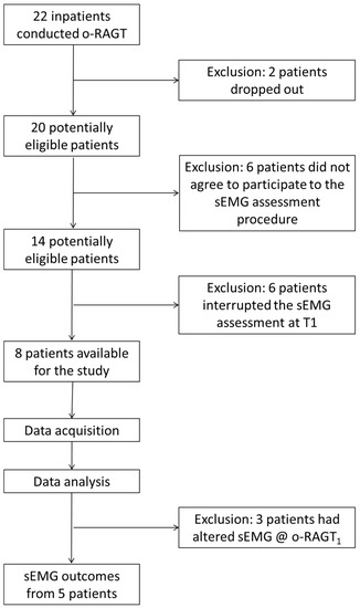 An observational preliminary study was conducted on subjects subacute post stroke who underwent o-RAGT in addition to conventional therapy. This is a secondary analysis from a large multicenter clinical trial assessing the effects of o-RAGT on clinical and biomechanical outcomes [14,15,16] and the barriers to the implementation of a sEMG-based assessment protocol in a clinical context [47]. The data covered by this paper were acquired and processed by a single center (IRCCS San Raffaele Roma, Rome, Italy).