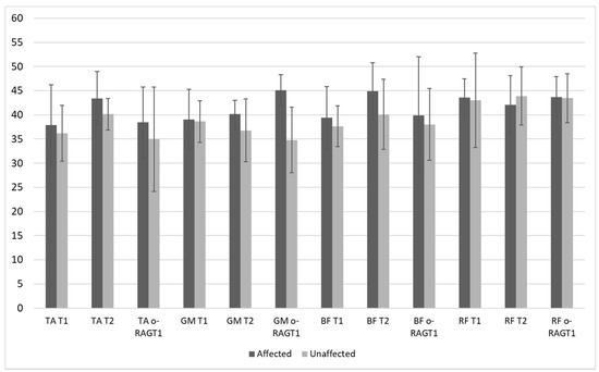 Figure 2 shows the RMS coefficients at T1, T2, and o-RAGT1 as mean and standard deviations values calculated on the whole sample. A mean increase of muscle activity (RMS) was registered at T2 in TA (affected and unaffected sides), GM (affected side), BF (affected and unaffected sides), and RF (unaffected sides). However, the standard deviations of RMS were high. The WPE (at o-RAGT1) increased the RMS coefficient of TA, GM, BF, and RF in the affected side only.