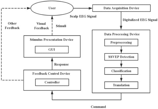 The stimulus presentation device presents stimuli to the users that can evoke the SSVEP. The data acquisition device records and digitizes the user’s scalp EEG that contains SSVEP so that it can be processed and analyzed by the data processing device. The data processing device converts digitized EEG signals into commands that can control the system. These commands are sent to the feedback control device, which performs functions corresponding to the commands received from the data processing device and gives feedback to the user. It presents the non-visual feedback (such as sound) directly through other devices and visual feedback on the graphical user interface (GUI) presented on the stimulus presentation device to the user.