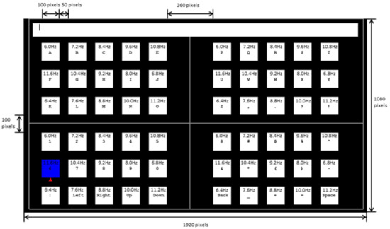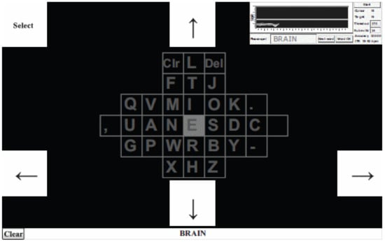 - Kick, C.; Volosyak, I. Evaluation of different spelling layouts for SSVEP based BCIs. In Proceedings of the 2014 36th Annual International Conference of the IEEE Engineering in Medicine and Biology Society, Chicago, IL, USA, 26–30 August 2014; IEEE: New York, NY, USA, 2014; Volume 2014, pp. 1634–1637. [Google Scholar]