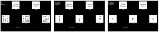 The SSVEP speller proposed in Reference [64] is considered to be a classic multi-stage SSVEP speller that consists of three stages with five commands per stage: three commands to choose a letter, a “Previous Action” command to cancel the previous command, and a “Delete Character” command to delete the last written character, as shown in Figure 4. Users can find the characters they want by using one command in each of the three layers [64].