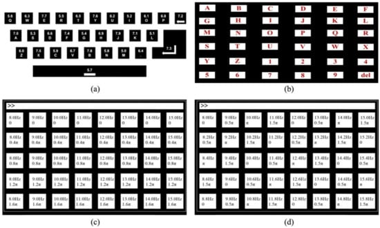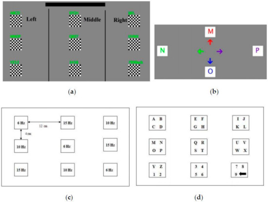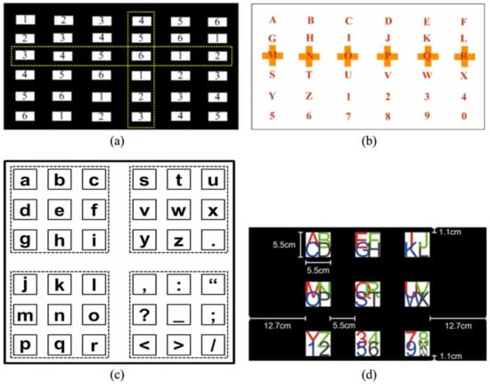 Three examples of the SSVEP (steady-state visual evoked potential) -P300 speller. (a) The frequencies’ array where different numbers represent different frequencies and subareas surrounded by the dashed lines flash at the same time to evoke the P300 potential. (b) GUI of the SSVEP-P300 speller proposed in Reference [84]. © IOP publishing. Reproduced with permission. All right reserved by [84]. (c). The graphical user interface (GUI) of the SSVEP-B-P300 speller (subareas surrounded by the dashed lines flash at the same frequencies to evoke the SSVEP potential. Only one of the targets of each sub-speller is enhanced to evoke a P300 potential and an SSVEP-B potential). © IOP publishing. Reproduced with permission. All right reserved by [88,89]. (d). GUI of the SSVEP-P300 proposed by Chang et al. [90].