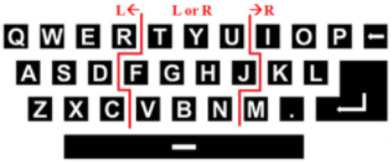 Graphical user interface (GUI) of the steady-state visual evoked potential (SSVEP) -eye-tracking (ET) speller using the QWERTY paradigm (the area to the right of the right red line is recognized as “right.” The area to the left of the left red line is recognized as “left.” The area between the lines is recognized as “left” or “right.”). © 2013 IEEE. Reprinted, with permission, from [95].
