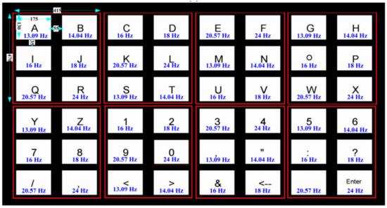 In the SSVEP-ET speller proposed by Mannan et al., 48 targets were divided into eight groups and displayed in a one-stage paradigm. The same frequency set (consisting of six frequencies) was used between groups, and each target within the same group used a different frequency, as shown in Figure 8. The ET was used to identify the group at which the user was gazing and the SSVEP to determine the specific target of the user within the group. The average accuracy and ITR of this speller were 90.35% and 190.73 bpm, respectively [97].
