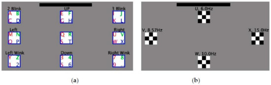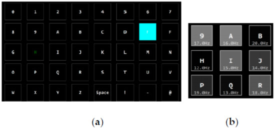 An example of the steady-state visual evoked potential (SSVEP) -electrooculogram (EOG) speller. (a) The paradigm of the primary stage. (b) The arrangement of frequencies of the secondary stage. Reprinted from [69,103], with permission from Elsevier.