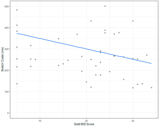 Switch costs (ms) by Gold MSI score obtained. The blue line is the fitted regression line.