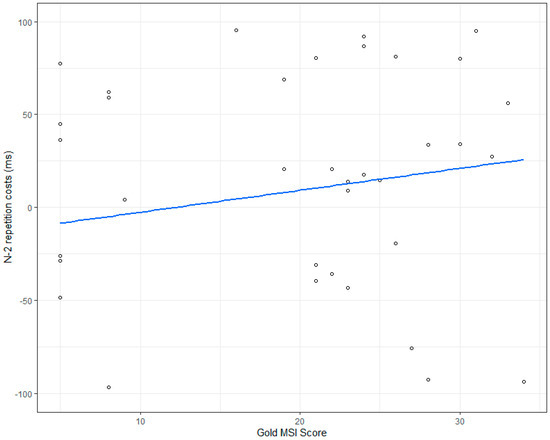 N-2 repetition costs (ms) by Gold MSI score obtained. The blue line is the fitted regression line.