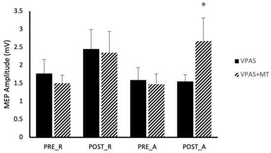 We examined single pulse MEP data through a two-way repeated measures ANOVA with factors time (Pre/Post intervention) and V-PAS (No Training/Training). At each collection point, twenty-four MEPs were recorded while the participant remained at rest. Results showed no main effect of time (F1,9 = 0.25, p = 0.632) nor a significant interaction (F1,9 = 0.00, p = 0.948) in the data; however, a significant main effect of V-PAS was observed suggesting MEP sizes were significantly reduced throughout the training V-PAS session compared to the no-training V-PAS session (F1,9 = 14.83, p = 0.004). However, this effect of V-PAS session appears to be driven by differences in MEP amplitudes at baseline between sessions (Pre-V-PAS No Training/Training: 1.17 ± 0.13 mV/0.97 ± 0.13 mV; p < 0.05).