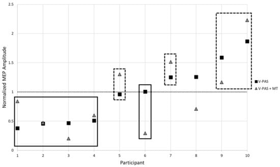 Participant responses to V-PAS (Solid Squares) and V-PAS + motor training (Dashed Triangles). MEP amplitude is normalized to baseline before V-PAS. Evident is the variable influence on excitability changes following V-PAS. Highlighted are groupings applied to the sample based upon average participant response to V-PAS. Participant 8 did not exhibit a consistent response and was excluded from a grouping.