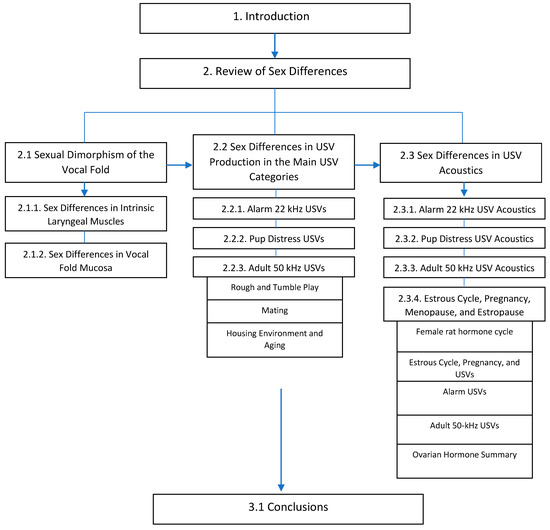 Understanding how hormones affect vocal structure and function (USV) is crucial for advancing science and clinical practice. As such, this paper reviews sex differences in laryngeal biology, USV production rates, and USV acoustics (Figure 1). More specifically, the summary of the known sex differences in the rat larynx was organized into intrinsic laryngeal muscles and vocal fold mucosa, and sexual dimorphism of the USV production and acoustics sections were summarized by primary USV category with rat strain and age reported as needed (Figure 1). To ensure that this review encompassed pertinent articles reporting sex differences in rat USVs, we created a PubMed search using the following search terms: ((USV) OR (ultrasonic vocalization) AND (female)) NOT (mouse). Authors then read the methods of the 540 article results and included all articles that compared rat USVs between sexes with significant findings within the results. The majority of articles were excluded for the following reasons: did not evaluate rat USVs, did not compare sexes, and did not include both sexes (Figure 2).