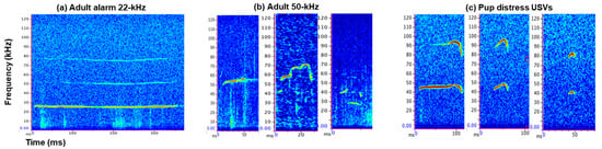 Spectrograms of the three main categories of rat USVs: adult alarm 22 kHz (a), adult 50 kHz (b), and pup distress USVs (c). We have included three subtypes of 50 kHz USVs (b) and three subtypes of pup distress USVs (c).