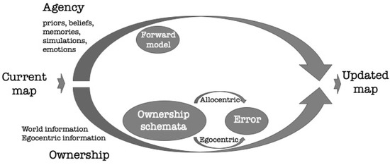 The agency-ownership model (modified from [18]). The agency (upper) arm uses self-originated agency-derived priors and beliefs, as well as the current mental map held by the self to predict the next version of the map using a forward model. The ownership (lower) arm uses one’s personal model of ownership (schemator) and egocentric–allocentric translation (the difference between the predicted allocentric map and the actual egocentric feedback perceived by egocentric and world-information) to correct the predicted map. The updated map (right) is dependent on these two processes.