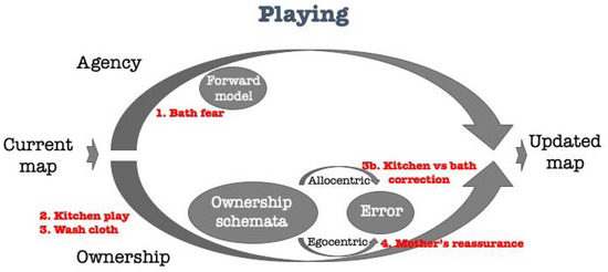 It is difficult to overestimate the importance of playing in Winnicott’s thinking. “It is in playing and only in playing”, he writes, “that the individual child or adult is able to be creative and to use the whole personality, and it is only in being creative that the individual discovers the self” ([1], p. 54). Playing is happening within the potential space, because, by definition, playing mediates in between the real world and the (playing) self. This includes masquerading, role-playing, pretending, theory of mind (guessing actions of a counter-player), symbolizing and creativity [2,49]. The self does not arrive tabula rasa to the play but carries with her many different “priors” which are part of the player’s personality, characterize her general state (e.g., general feeling during the playing day), or specific emotion evoked by the play. In the same vein, each player has a specific ownership-schemator, which processes information acquired during playing, and a personalized error detection threshold and correction mechanism. To reiterate, to exploit the role of playing in bridging the potential space it is crucial to have a sense of agency, “the sense that I am the one who is playing”, with all the “priors” oneself carries. It is not less important to have the reciprocal feeling of ownership, “the sense that I am the one who is undergoing the playing experience”, a self who has a certain way to process the world and relating the ongoing experience to it.