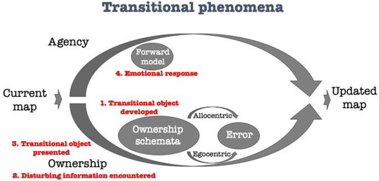 The “transitional object” is probably Winnicott’s most well recognized contribution. Winnicott notes that he “introduced the terms “transitional objects” and “transitional phenomena” for designation of the intermediate area of experience, between the thumb and the teddy bear, between the oral erotism and the true object-relationship” [50]. In between the experiencing-self and the experienced reality lies the experience itself. This third entity is critical since, on the one hand, it distinguishes the self from reality, but on the other hand maintains their mutual relations. Winnicott further extended his observations regarding the transitional object to a more general concept of transitional phenomena, “an intermediate state between a baby’s inability and his growing ability to recognize and accept reality” [50]. This recognition may be related to a sense of agency, the sense that “I am the one whose ability to recognize reality is developed”, complementing a sense of ownership, “I am the one undergoing a transitional phenomenon” (or “holding a transitional object”).