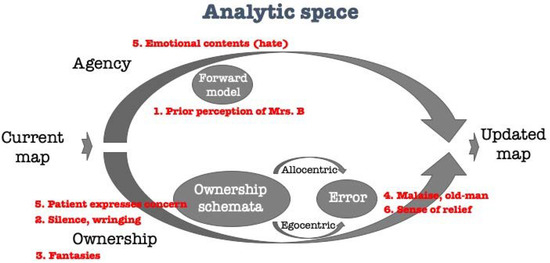 For illustration, Ogden [52] details the story of an analysis of a patient of him, Mrs. B. Mrs. B was a 42-years-old married lawyer with two children, who started analysis for an ill-defined reason that “she had felt vague discontent with her life”. This first description of the patient already influences the mental model representing her in the analyst’s mind, via the agency-arm (Figure 4), as a patient who suffers from relatively mild difficulties. The analyst then faces several perceptions of the patient (“world-information”) through long periods of silence (~15–20 min each) as well as a continuous hand-wringing. Following, he finds an egocentric (“path-integration”-like in the model) perception that his “own fantasies and day-dreams were unusually sparse during this period of work.” This experience further influences the process such as the mental model of the patient is as the analyst “experienced less of a feeling of closeness to Mrs. B” [37]. This is further translated in the analyst to a flu-like feeling—with malaise, nausea and vertigo, and then to an even more general impression in the analyst of himself as “a very old man”. The bodily feelings may be the result of an inability of the gain function [47] to compensate well for the analyst’s perception (or hate) of the patient [55]. Note that the agency-arm as well may introduce (1) a general feeling which is not necessarily related to the specific patient herself, (2) a general feeling of the patient while encountered (here is negative in general), and (3) concrete impressions of the analyst while at the current situation.