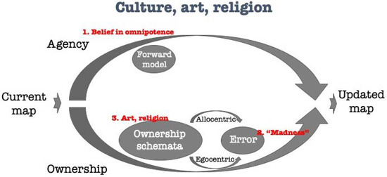 Illusion takes a central role in Winnicott’s theory [61]. Early on, the infant holds a prior illusionary belief in her omnipotence power regarding the world. This illusion, which is considered as a normal development, dictates the infant’s experience, and is inserted through the agency-arm (Figure 5). On the other hand, there are delusions which are defined as “madness”. Madness is an inherent disturbance within the system. Previous authors suggested that schizophrenia is primarily a disorder of agency, since contents that do not exist in reality (delusions) are inserted into the cognitive system [25,62,63,64]. The problem may be, however, found as well within the ownership-arm, either in the ownership-schemator which may create deviating schemata, or in the gain applied for error corrections. In daily experience, as is also expressed by the agency-ownership model, there is an inherent difference in between perception and estimation. This difference is corrected by the agency and ownership operators with a certain gain applied [47], giving rise to a new updated map. When there is a dysfunction in gain applied, the gap overpasses a certain threshold, and the system’s product is perceived as a delusion (“madness”). It is in the arts or religious experience, as exemplified above, where such products (through designated ownership-schemator) are acceptable. Moreover, beliefs which are apparently accepted by the community (as artistic or religious practice/spirituality) may further enter the process via the agency-arm. That way, these beliefs also allow to enlarge the error between the ownership-schemator and the egocentric experience as these is further corrected while encountered with the agency-arm.