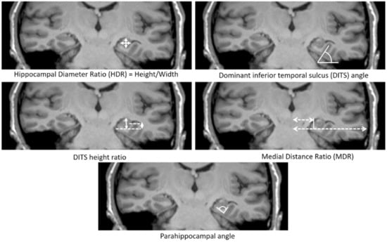In the past decade, several quantitative methods for HIMAL have been developed (Figure 2). Bernasconi et al. used medial distance ratio (MDR) and parahippocampal angle (PHA) to represent the medial localization and verticalization of the hippocampus [18]. Tsai et al. expanded the quantitative methods using five additional quantitative measurements—hippocampal diameter ratio (HDR), DITS angle, DITS height ratio, MDR, and the PHA [20]. In a blinded analysis of 103 healthy volunteers, only three measures (HDR, DITS height ratio, and PHA) were significantly associated with the diagnosis of HIMAL. These features correspond to a more rounded hippocampus, deep DITS and hippocampal verticalization observed in qualitative traits. The quantitative assessment of HIMAL is more objective than visual criteria and is recommended for future studies on this subject, for example, a recent study of HIMAL in juvenile myoclonic epilepsy (JME) [23]. More studies are needed to determine the utility of using quantitative measurements to facilitate the diagnosis of HIMAL.