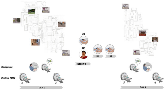 The experimental timeline is illustrated in Figure 1. On Day 1, sessions were conducted in the afternoon from 13:00 to 20:00. Participants (n = 50) were first scanned during a 5-minute resting state session (rsfMRI 1), then had 45 min outside of the scanner to explore and learn the Level 1 of the virtual city, followed by a behavioural navigation test where they had to reach as fast as possible 10 targets within the learned environment (see below). They were then scanned while performing the navigation test again (i.e., 10 targets to reach) for approximately 8 min, and then scanned again during a second resting state session (rsfMRI 2). A subset of participants was randomly assigned either to the regular sleep (RS; n = 16; 9 males) or to the sleep deprivation (SD; n = 18; 10 males) condition. Participants in the RS group were allowed normal sleeping at home and were requested to follow regular sleep habits for the 3 experimental nights. In the SD group, participants were kept awake in the laboratory during the first post-learning night. During this SD night, their physical activity was maintained as low as possible under constant supervision by the experimenters. Participants remained most of the time in a seated position, and were allowed to read, chat, play quiet games and watch movies. They received isocaloric meals at regular intervals, and water ad libitum. At 8:00 am, they were allowed to leave the lab, and were instructed to have non-dangerous daytime activities and abstain as much as possible from napping until bedtime. They then slept normally at home the two following nights. Sleep quality and quantity for each night from before the first learning session (Day 1) to the last testing session (Day 4) was assessed using a daily standardized questionnaire [36] controlled by visual inspection of continuous actimetric recordings (ActiGraph, wGT3X-BT Monitor, USA). On Day 4, SD and RS participants came back to the laboratory for a second experimental session. First, they were scanned in the resting state (rsfMRI 3), then scanned using fMRI while engaged in a Level 1 navigation retrieval test similar to Day 1 (i.e., 10 targets to reach). To control for potential circadian confounds, fMRI scanning took place at the same time of day as the initial testing for each individual. Afterwards, participants were trained outside of the MRI scanner for an additional 40 min on an extended version of the navigation task (Level 1 and 2 of the town, see Figure 1), in which were also incorporated the targets and environments of the initial training. They were then scanned again in the resting state (rsfMRI 4) and finally tested on the extended version of the navigation task outside of the MRI environment. A high-resolution structural MRI scan was also acquired for each participant at the end of the brain imaging session, on either Day 1 or Day 4.