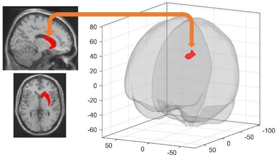 - Tzourio-Mazoyer, N.; Landeau, B.; Papathanassiou, D.; Crivello, F.; Etard, O.; Delcroix, N.; Mazoyer, B.; Joliot, M. Automated anatomical labeling of activations in SPM using a macroscopic anatomical parcellation of the MNI MRI single-subject brain. Neuroimage 2002, 15, 273–289. [Google Scholar] [CrossRef] [PubMed]