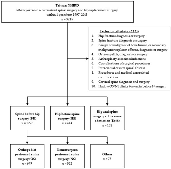 Patients undergoing specific hip arthroplasty and lumbar spine decompression or fusion procedures were selected using NHIRD procedural codes (see Table A1). Patients admitted for primary hip arthroplasty, including total hip arthroplasty (64162B) or partial hip arthroplasty (64170B), from January 1997 to December 2013, were identified from the Taiwan NHIRD. From that subset of patients, those who were 50~85 years old and who had received lumbar spinal surgery, including fusion surgery (83043B, 83044B, 83045B, or 83046B), laminectomy (83002C or 83003C), or lumbar discectomy (83024C) within 1 year before or after hip replacement surgery, were enrolled. All inclusion and exclusion procedure and diagnostic codes are listed in Table A1, Table A2 and Table A3. In order to select for patients undergoing surgery for lumbar or lumbosacral degenerative disease, patients receiving a cervical discectomy (83022c), procedures for spinal fracture (64160B), or with a diagnosis of a cervical spinal disorder (ICD-9 CM: 723*) or spinal trauma (ICD-9-CM: 805* or 806*) were excluded. Patients not seen in either an orthopedic or neurosurgery clinic within 6 months of their first surgery were also excluded.