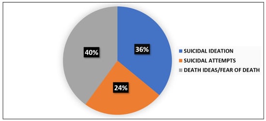 The presence of suicide thoughts was evidenced in 35% (n = 38) of the sample as to the suicide item of the Hamilton Depression Scale (HAM-D), with 18% (n = 20) reporting a severe suicide risk. The assessment of suicidal risk at admission as to the Columbia Suicide Severity Rating Scale (C-SSRS) was performed in 63 subjects of the total sample: 25 (39%) patients were positive for suicide attempts (n = 6), suicidal ideation (n = 9), or death ideation (n = 10). The percentages for each item are reported in Figure 1.