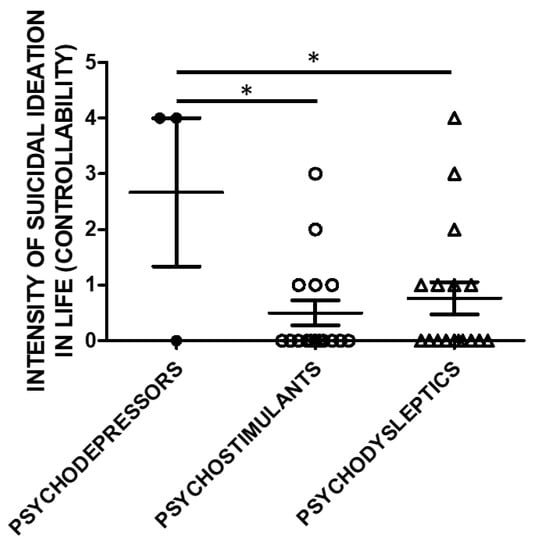 Suicidal Ideation Intensity (SSI; Controllability) and categories of substances of use. The history of controllability and its correlation with substance categories was evaluated in a subset of the study cohort. Three used psychodepressors, 16 psychostimulants, and 17 psychodysleptics. Statistical analysis employed One Way ANOVA, followed by Tukey’s post-hoc test, F = 4.299, df = 2, * p < 0.05).